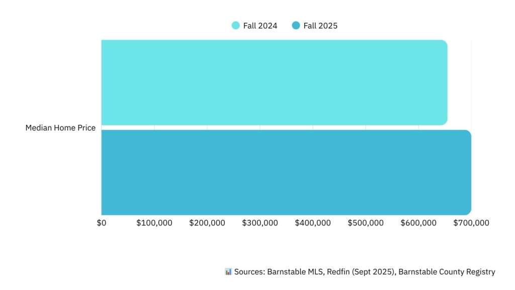 As of Fall 2025, Barnstable’s median home price is about $700,000, up nearly 7% from last year, with homes averaging 42 days on market. Buyers face affordability challenges, while sellers must price strategically to move homes faster.